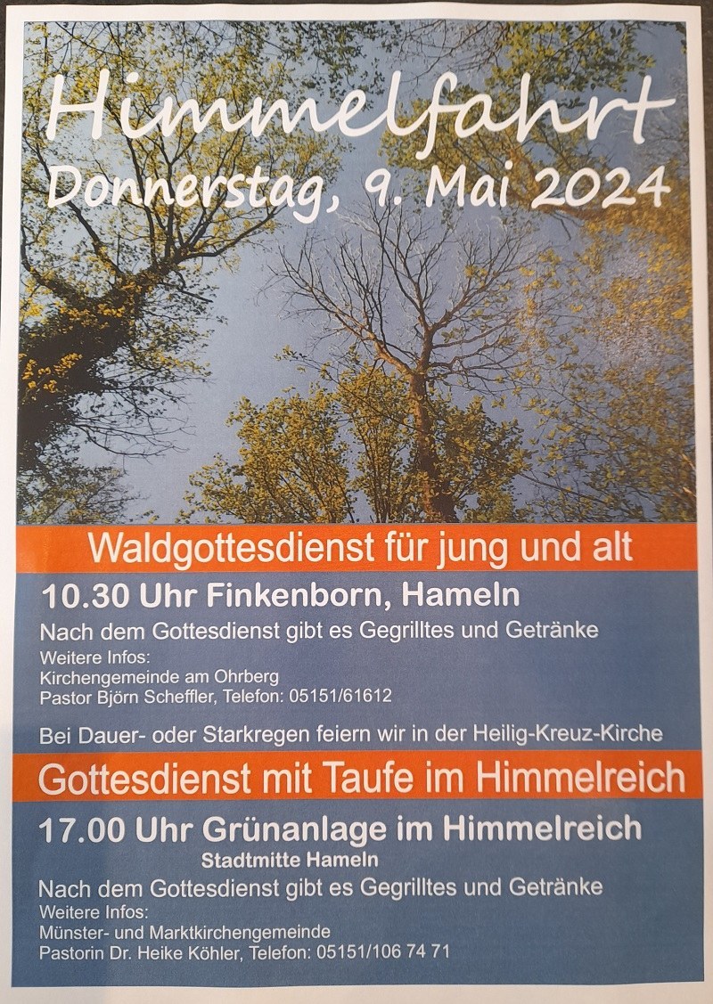 Himmelfahrt im Himmelreich! Am Donnerstag, den 9. Mai um 17.00 Uhr feiern die Innenstadtgemeinden Markt und Münster zum ersten Mal Gottesdienst im Himmelreich (Innenstadt).