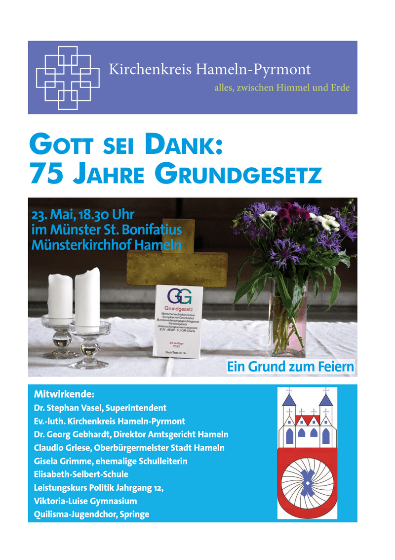 Unser Grundgesetz hat Geburtstag. 75 Jahre. Wir sagen: „Gott sei Dank!“ und laden sehr herzlich ein, diesen Tag am Donnerstag, 23. Mai, um 18.30 Uhr im Münster in Hameln zu feiern.