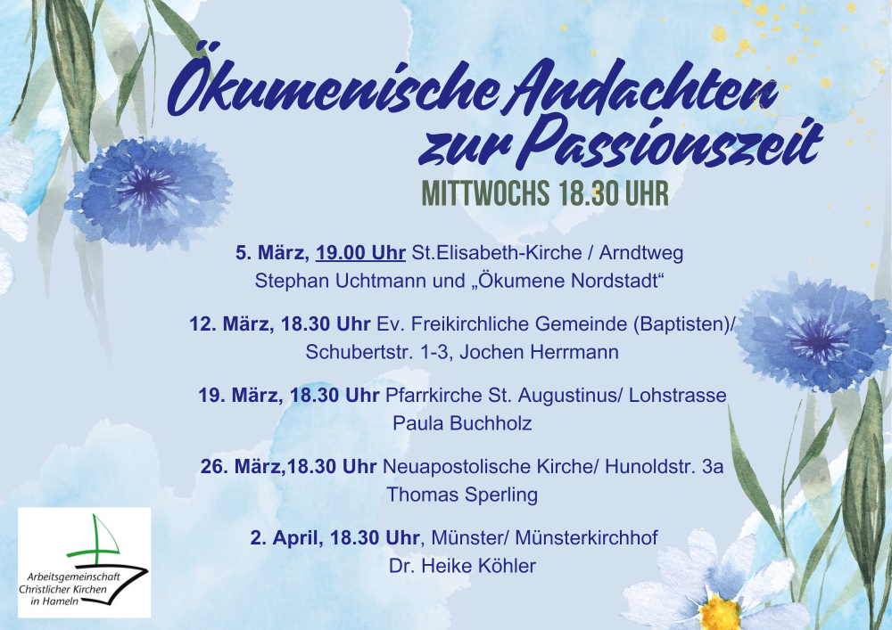 Auch in diesem Jahr gibt es wieder ökumenische Andachten zur Passion vom 5. März bis 2. April an verschiedenen Orten in Hameln.